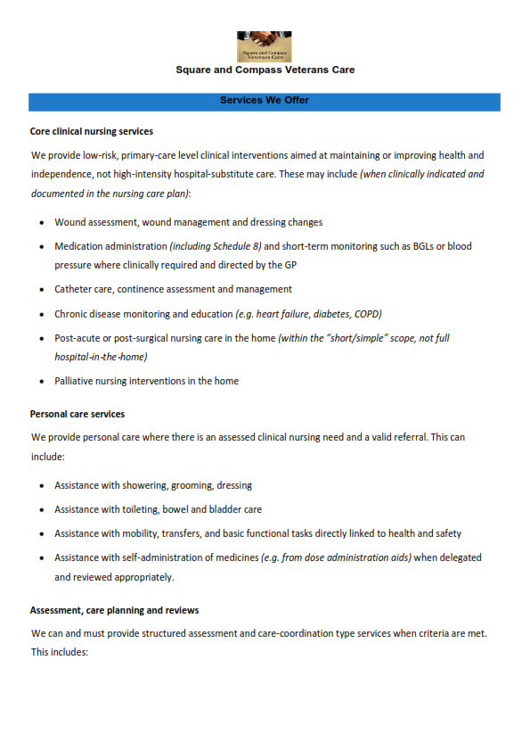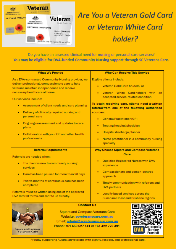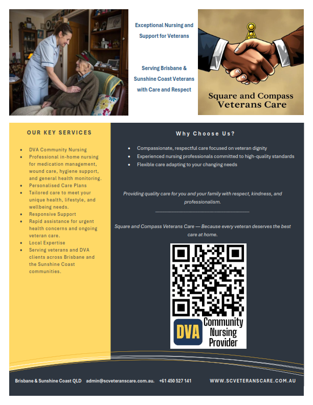 At Square and Compass Veterans Care, we offer a range of specialised nursing services tailored to meet the unique needs of DVA clients. Our dedicated team provides compassionate care, ensuring that each veteran receives personalised support in the comfort of their own home. We are committed to delivering quality care with respect and empathy.